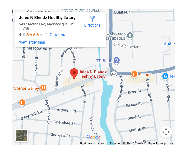 Juice N Blendz of Massapequa is a healthy eatery offering a large variety of healthy, organic juice, smoothies, breakfast, lunch and dinner selections. We also provide nutritional supplements, grab n’ go organic vegan wraps, acai bowls, a chopped salad bar and more!